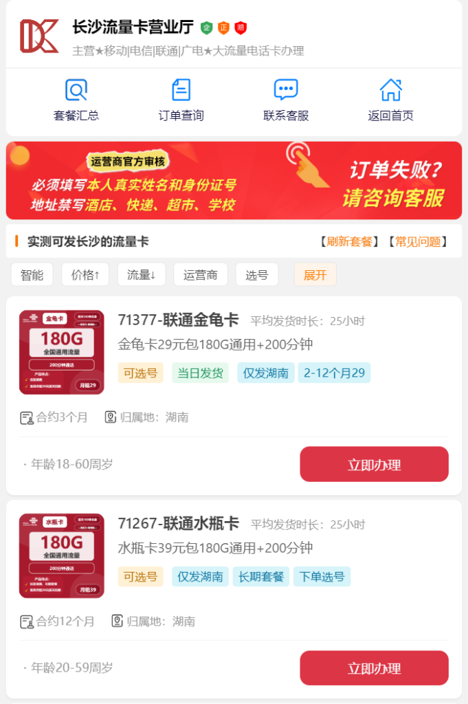 如需要长沙本地号用于收验证码或求职沟通,可选择标注“仅发湖南”的电信或联通套餐。
